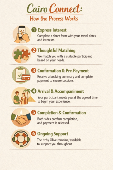 Cairo Connect is not a tour company and does not provide licensed guiding services. Local participants only offer language support and everyday assistance — not formal tours.