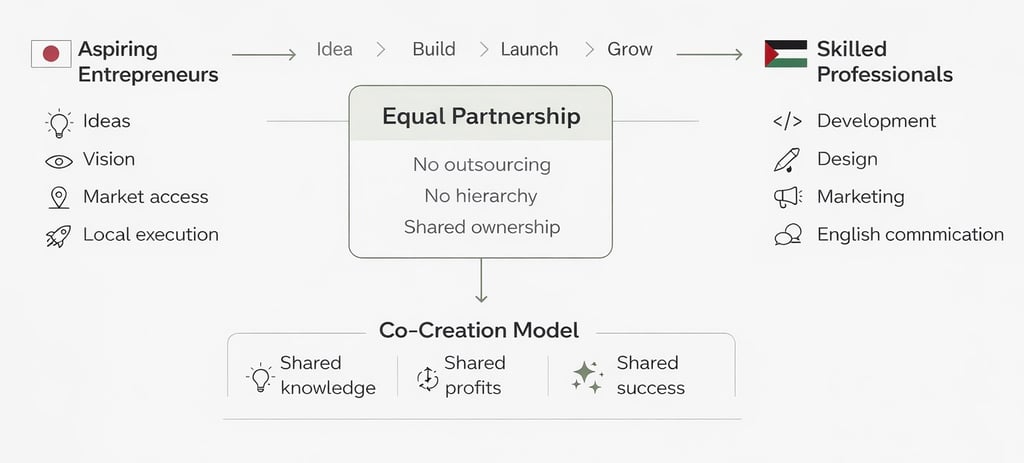 Bridge to Venturesは、このギャップを埋めるために存在する。外注でもなく、支援でもない。対等なパートナーシップとして、日本の起業家とガザのプロフェッショナルをつなぐ。片方がビジョンを持ち、もう片方が実行力を持つ。両者が協力しながらビジネスを立ち上げ、知識、利益、そして成功を分かち合う。